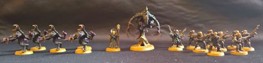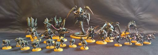 The Tyranids are an invading alien species from another galaxy. Their advance through the galaxy grows in strength and they have many forces scouting ahead of the main fleets. There are no individuals among the Tyranids, every one of the myraid of creatures that make up their armies from the smallest scuttling beast the most massive bio-titan and hive ship is the equivalent of a single cell in a living organism linked via the hive mind.