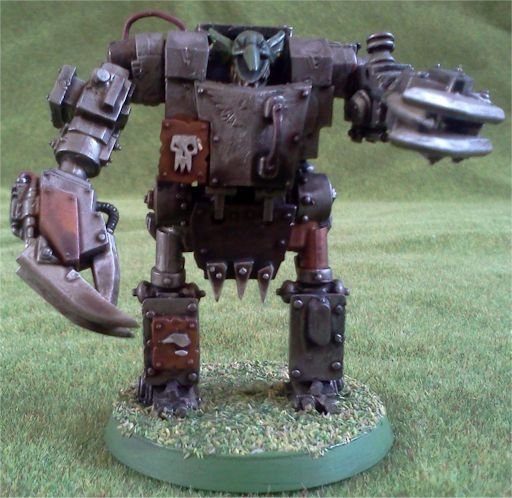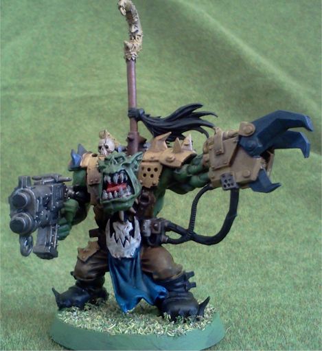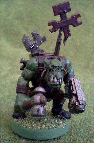 The head of a plastic gretchin, a pair of ork powerclaws and a whole load of random spare vehicle parts produced this figure. ounted on a 40mm base. Tick. Tick. Tick.