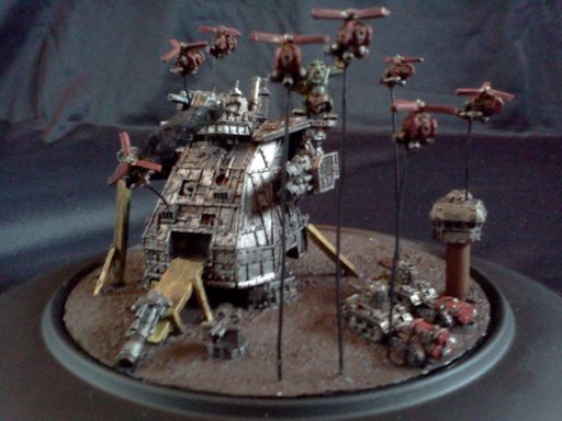 Making a snotling the size of a stompa in 28mm scale was not practical, so instead here is an epic scale (6mm) diarama of the overgrown snotling coming under attack from ork deathcopters. The snotling itself was made from an older 40k scale gretchin with its weapons removed, while the other models came from the Epic range. The control tower is part of the gargant kit mounted on a short piece of plastic pipe. The base is an upturned plastic plate with a 5" blast template placed inside. |
