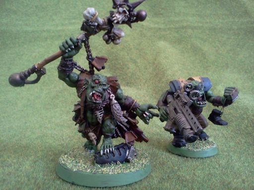 Drazzok 'Eadbanga is, naturally enough, made from a ork weirdboy. The gretchin handlers have been removed and extra totems added. Thuggrim Da Mad uses an ork nob from the nobs boxed set with a heavily modifed gun. The eyepatch is made of thin plasticard, while the bootlaces of the boot he holds are thin copper wire. |