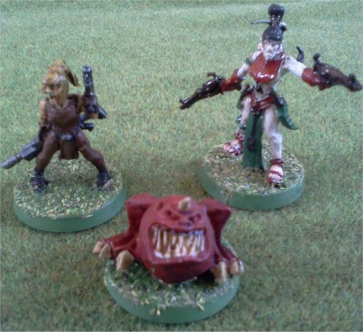 The later additions to Hazug's band. Salia is modelled using a Necromunda House Escher juve while Mayleth uses the body of a Mordheim amazon warrior with dark eldar head and weapons added. Cuddles is simply a fantasy squig on a round base.