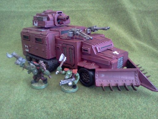 Hazug's truck is a slightly modified ork trukk kit. I always move the weapon mounting up onto the roll cage on my trukks. For this model I also scratchbuilt the front seats since it was not going to ahve a driver. |