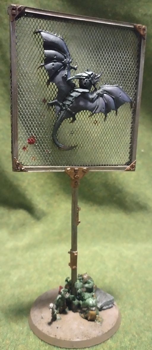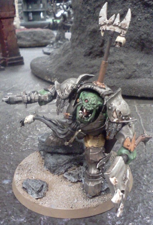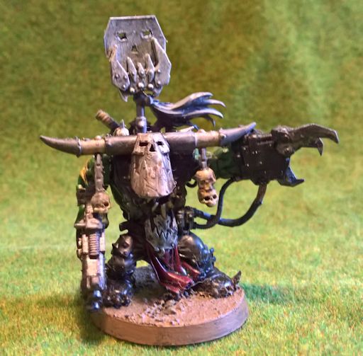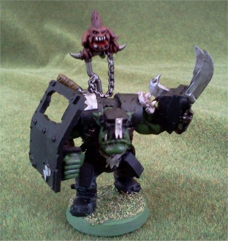 This Goff clan warboss uses the plastic warboss from the Assault on Black Reach set and swaps the head for the top of a fantasy Orc banner to give him a crude helmet.
