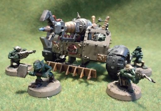 This traktor cannon is built from various spare parts and pieces of plasticard to fiull in gaps. The crew are an asortment of Gretchin crew.