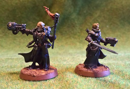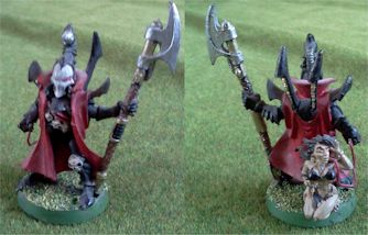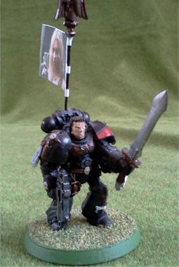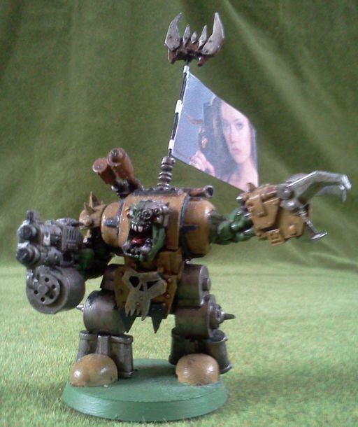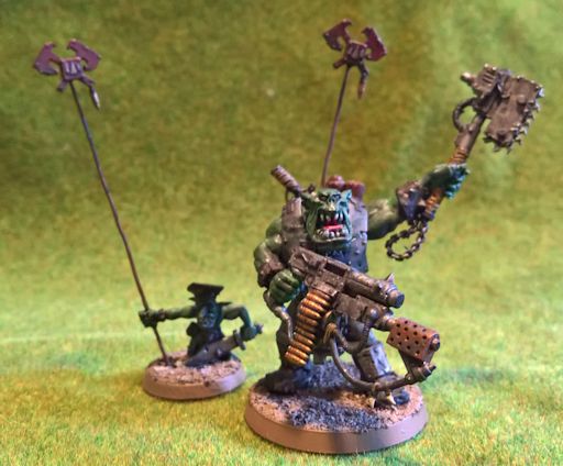 Another clan specific warboss, this Blood Axe is based on the idea that his clan would adopt a lot of Imperial style equipment. To reflect this the body of the warboss is taken from the Ogryn kit with an Ork head and arms added. His personal banner waver has a commissar's hat taken from the Ogryn kit speaker.