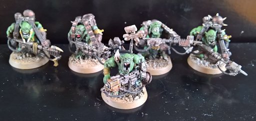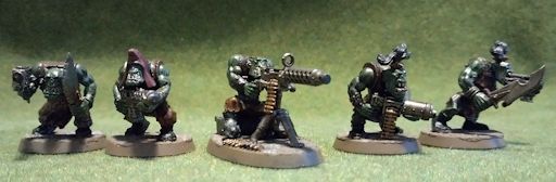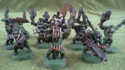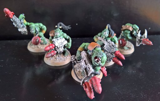 The Orc boys available for the Old World fantasy game are fully compatable with those for 40k. These Ork boys have been made by adding the 40k weapons to the bodies from the fantasy Orcs.
