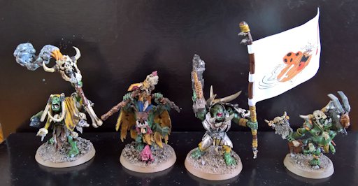 These character models used a variety of Orruk figures. From left t right the two weirdboys are based on a Weirdnob Shaman and a Wurrgog Prophet that needed very little converting, they could have been fielded as they were. The Waaargh banner waver was made from a Warchanter and finally the pigdok is made from a Wardokk with an added powerclaw.