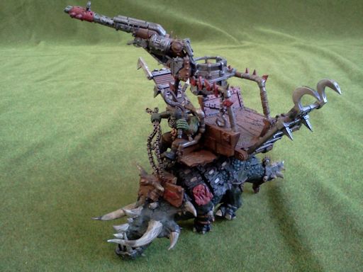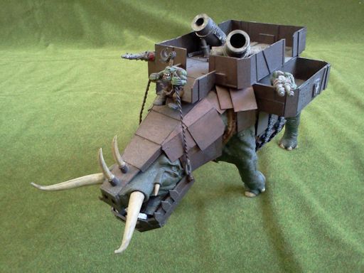 Orks This big squiggoth was built using a Warhammer Fantasy Lizardman Stegadon with a howdah made from the bodywork of a 40k ork trukk. The suggestion for this was put forth by the manager of Games Workshop's Manchester store. Up from the big squiggoth is the gargantuan squiggoth.This one is amde from a Lord of the Rings war mumak. This was widened and lenghened with plasticard and the extended sections concealled beneath the platting of the scratchbuilt plasticard howdah. |