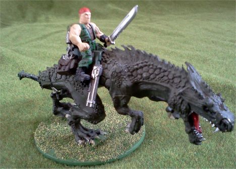 Catachan Jungle Fighters The big brother of my Catachan rough riders, a plastic jungle fighter riding on a fantasy carnosaur. Some time ago Games Workshop publiched rules for using large fantasy creatures in game of Warhammer 40k in an issue of White Dwarf. Another regular customer at GW Manchester put these to use. Since then the manager has updated and expanded these rules and offers then for download from the store's Facebook page. |