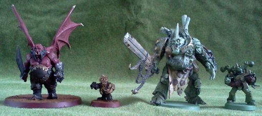 Chaos This daemon prince is made from a Warhammer Fantasy giant with wings from a Lord of the Rings Balrog added. the wings fit surprisingly neatly. This squat daemon prince is also made by adding wings to a larger figure, in this case a plastic ogre bull. It is then mounted on a 60mm round base. For scale I've shown it next to an originalCitadel Chaos Squat and a daemon prince and chaos marine of Nurgle. |
