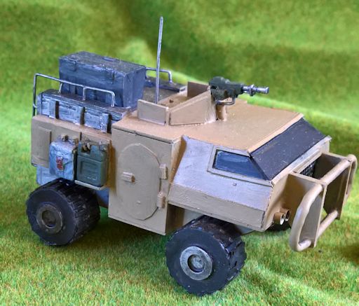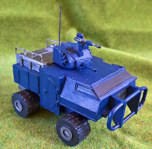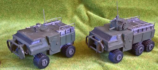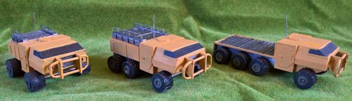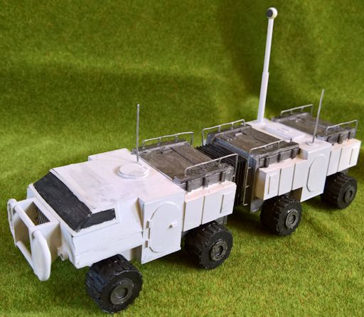 Wheeled Of World Explorers The off world explorer is a wheeled vehicle that also uses just one sheet of plasticard for its core. However, being wheeled it also requires some short lengths of plastic tube for the wheels. The plans for the core are in the Projects section. The basic civilian explorer presented in the plans can be configured as a four or six wheeled vehicle or as an eight wheeled flat bed. The addition of a compact turret turns the basic civilian vehicle into an internal security vehicle for law enforcement or paramilitary forces. A trailer created by doubling up the rear section of an explorer has been used to extend this variant into a mobile research vehicle. The design of the explorer also makes them useful as military vehicles. These two versions have been armed to create lightly armoured second line support vehicles. This is an eaxmple of a more ad hoc combat vehicle, probably used by mercenaries who do not have access to true fighting vehicles and could be the sort of vehicle used by player characters in a sci-fi roleplaying game. |
