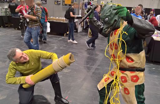 Star Trek Modelled after the diamond shooting bamboo cannon from the original series episode 'Arena', this replica was made from a length of plastic duct pipe with balsa wood used to give it the appearance of thickness as well as to block off the rear end. String and rope covered in tissue paper were used for the external details. This prop was made to add a more unusual feature to a costume for a Star Trek convention where not quite everyone seemed happy to see me...
