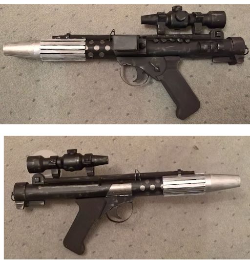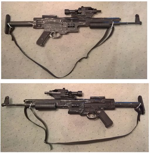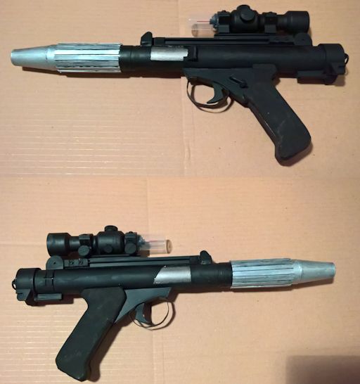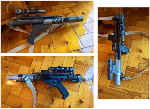 Star Wars This is the basic version of the DH-17 carried by rebel fleet troopers in 'A New Hope.' This model is actually the second one made, the first being a prototype to prove that it was possible. This second model then corrected the slight errors of the first. That prototype still came in usful though when I was able to get it autographed by Christopher Patrick Nolan, the actor who played the rebel trooper who yells "Launch!" in 'Rogue One.' Instructions for making rebel fleet trooper blasters and other DH-17 types can be found in the Projects section. This is the modified verison of the DH-17 that was first seen in 'The Empire Strikes Back' carried by the rebel soldiers on Hoth. Some of them also carried the original fleet trooper version and in the Rebel Legion either type is acceptable for the Hoth Trench Trooper costume. Based on the German Stg-44, the Blastech A-295 was carried by rebel troops on Hoth. This model was built using massive amounts of plastic pipe to give me a weapon that was light enough to easily carry at conventions. Another version of the DH-17, this was one of the variants seen in 'Rogue One' carried by rebel soldiers on Scariff. I made this because I was already familiar with making the DH-17 (this was the third one I made) instead of undertaking the more complicated construction of an A-300 carbine or rifle. Many of the rebel soldiers in 'Rogue One' wore a helmet obviously based off the US M1 pattern steel helmet with an added outer armoured ring. This copy of the prop uses the same plastic M1 replica as the Aliens M10 helmet for the basic helmet without any alteration. The outer armoured ring was then made from two more of the same type of helmet. I have not prepared written instructions for this but there is a video guide on my YouTube channel. Glimpsed brief during 'Rogue One' and then again in 'Solo', this is the Corporal Casrich helmet. Made largely from plasticard, a construction guide can be found in the Projects section. First seen in 'Return of the Jedi', and then again in 'Rogue One' the Endor trooper donut is worn by many rebel soldiers. The donut is made entirely from plasticard (for far less than what one of the available kits would have cost) and instructions can be found in the Projects section. One of the most basic replica props presented here, this is the disk used by the Rebel Alliance to store the stolen plans of the Death Star in 'A New Hope.' Instructions for making this can be found in the Projects section.