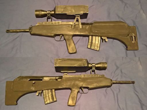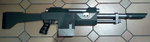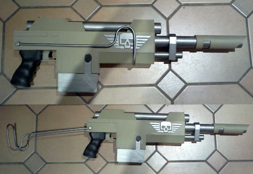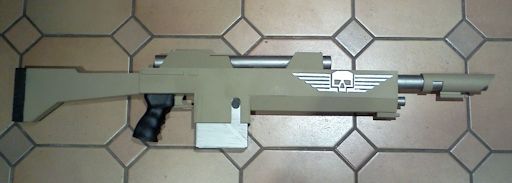 Warhammer 40,000 This las gun replica is built around a length of plastic pipe that runs all the way back to the start of the stock. By bracing the other parts against this the prop is very sturdy. It should be noted that although some source material suggests a las gun is only 90cm long this model is about 120cm long, around the same length as real world battle rifles such as the Heckler & Kock G3 or FN FAL. This makes it more in scale with the weapons shown on Games Workshop Imperial Guard figures. The only structural difference between this prop and the Cadian las gun variant is that more of the core pipe is exposed while a longer piece of pipe is used for the lower strut. Modelled after the folding stock carbine on the Imperial Guard tank accessory sprue, this model uses the same body design as the Catachan las gun but the length of the barrel is greatly reduced and the fixed plastic stock is replaced by a folding one made from 6mm copper pipe. In hindsight solid copper wire would have been easier to work with. |