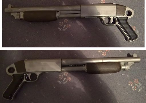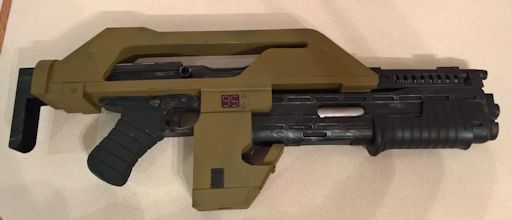 Aliens This M10 marine helmet is made from a pair of plastic replica M1 helmets. One forms the base while the other is cut to provide the thick front plate and side plate above the earpiece that has been made from a set of ear defenders cut down.. The lobster plates are plasticard with milliput ridges and the camera is a resin cats part. The technical kit used by Private Hudson to open the colony door was a collection of electronic parts and tools in a custom wallet. For my copy I have been forced to improvise somewhat, building ht ecircuit boards and LCD out of plastic and the keypad out of balsawood. The various parts are mounted on thin card with strips of fake leather fabric at each end. The wallet itself was made from an Israeli army map case. This copy of the classic M41A pulse rifle was made almost entirely form plasticard. However, parts of an airsoft SPAS 12 were used for the grenade launcher. I was lucky enough to be able to get this autographed by Michael Biehn at a convention. This model of Corporal Hicks' shotgun uses parts from two air soft guns. Firstly a pump action shotgun that had its ejectoon port covered in plastic to resemble an Ithaca model gun and the barrel and magazine were replaced by suitably wide plastic pipe cut to the correct length. Then the back end of an air soft MP40 was used to make the grip section.